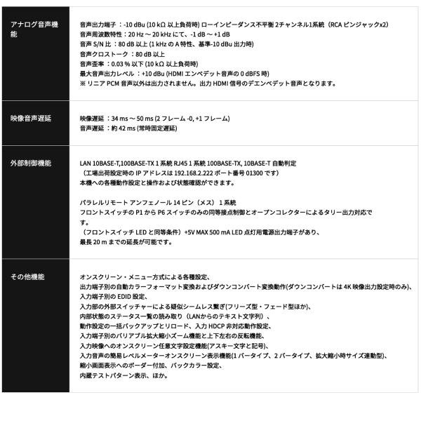 最大音声出力レベル :+10 dBu (HDMI エンベデット音声の 0 dBFS 時)