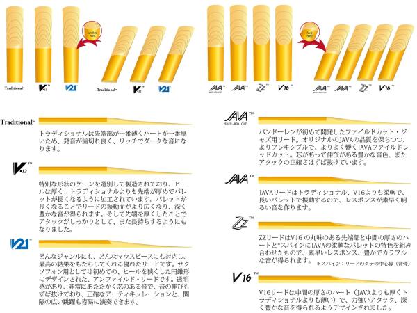 定番のスタンダード。長年にわたって高い評価を得ている一番幅広く使われているリードです。非常に薄いティップからきわめてピュアな音質が生み出されるよう にデザインされており、また振動する部分のコシが強くJAVAやV16よりもパレット(最大限に振動する部分)が厚くなっています。