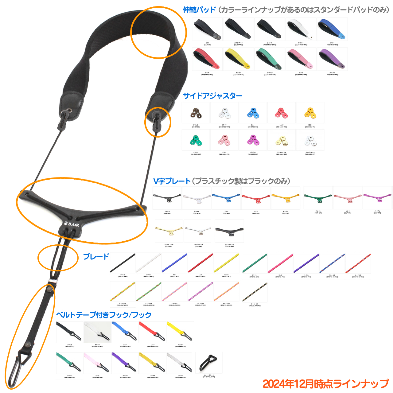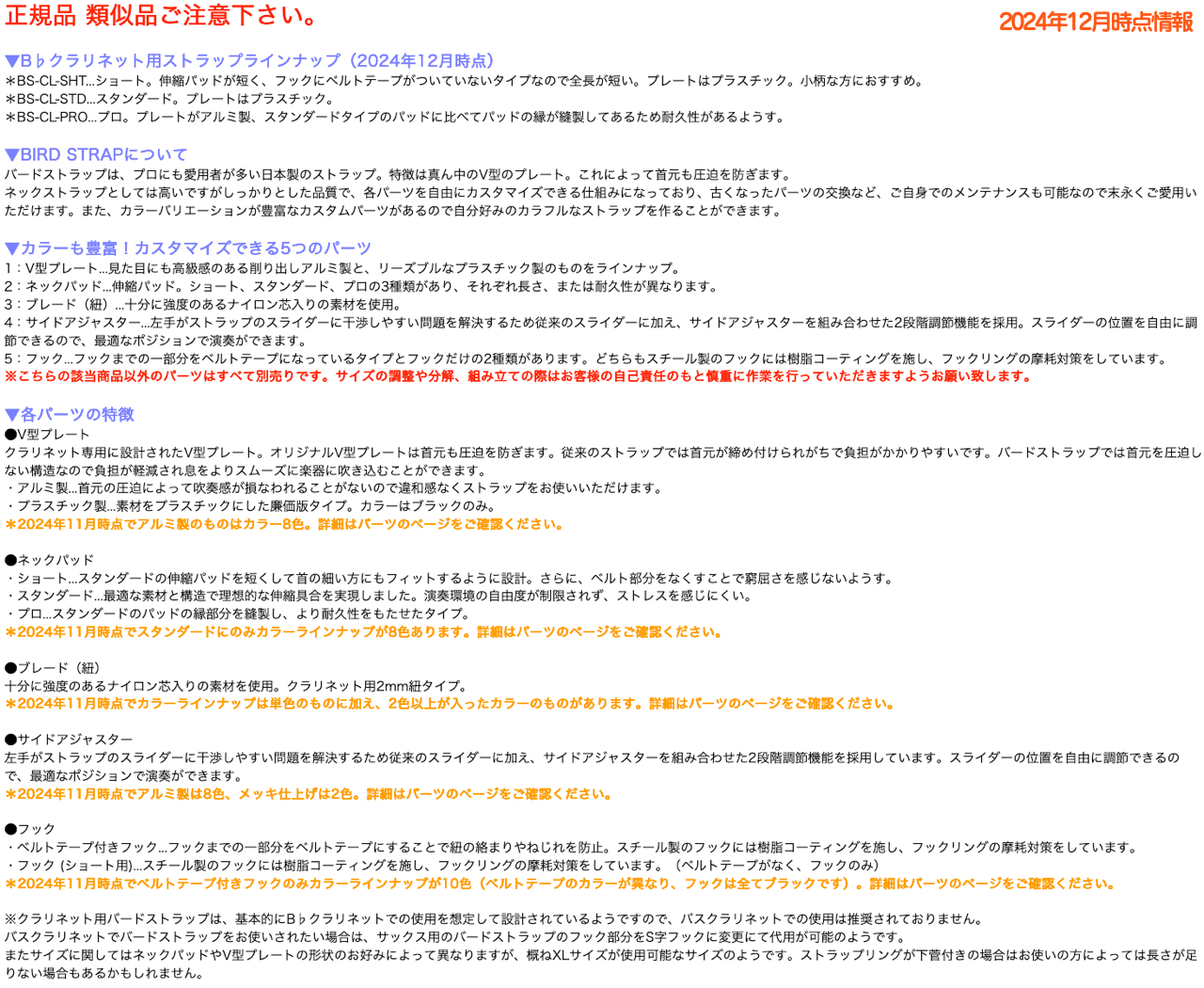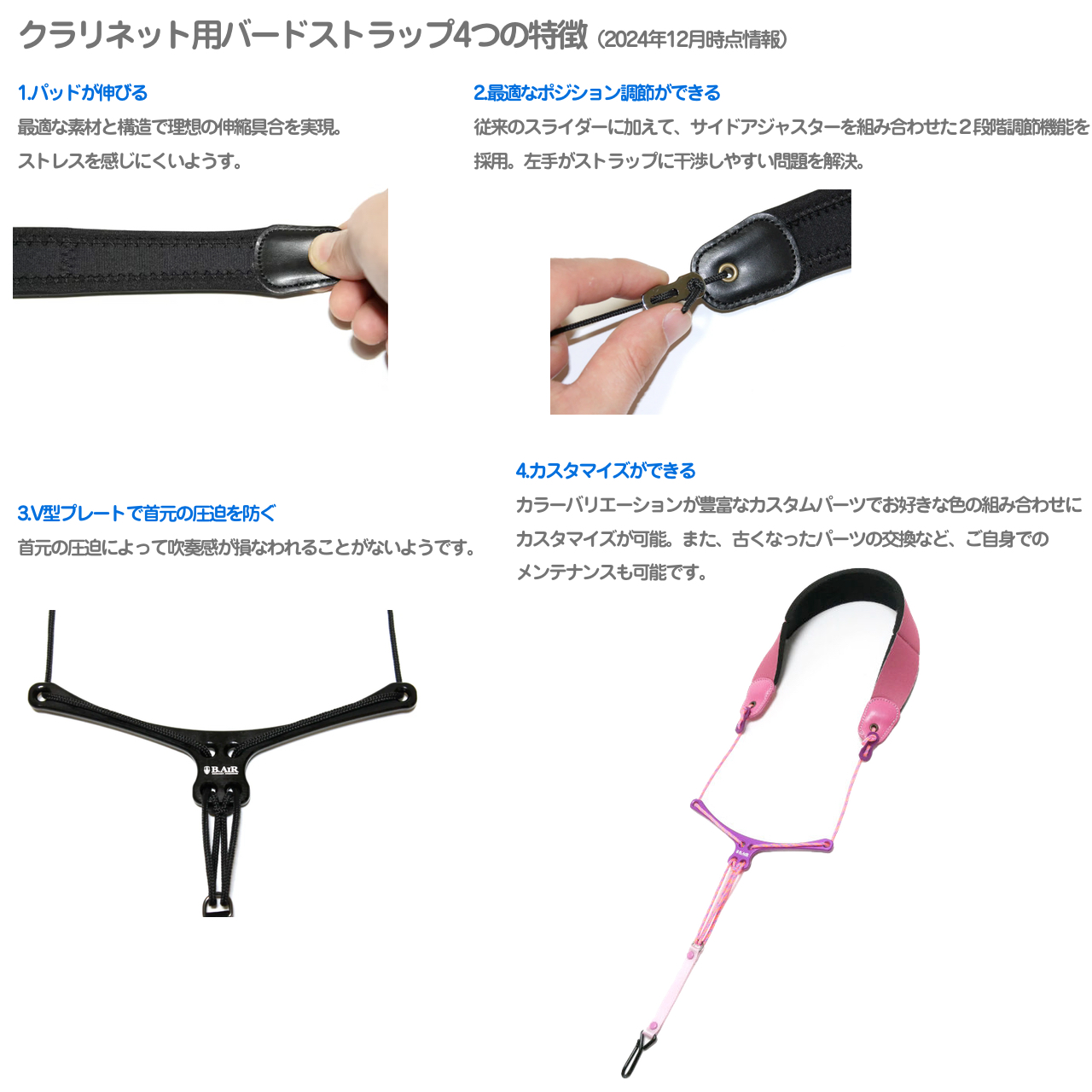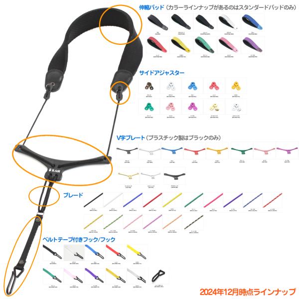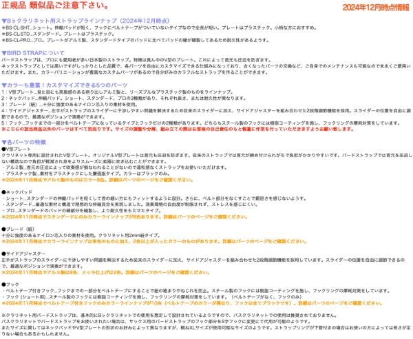▼B♭クラリネット用ストラップラインナップ(2024年12月時点) *BS-CL-SHT...ショート。伸縮パッドが短く、フックにベルトテープがついていないタイプなので全長が短い。プレートはプラスチック。小柄な方におすすめ。 *BS-CL-STD...スタンダード。プレートはプラスチック。 *BS-CL-PRO...プロ。プレートがアルミ製、スタンダードタイプのパッドに比べてパッドの縁が縫製してあるため耐久性があるようす。