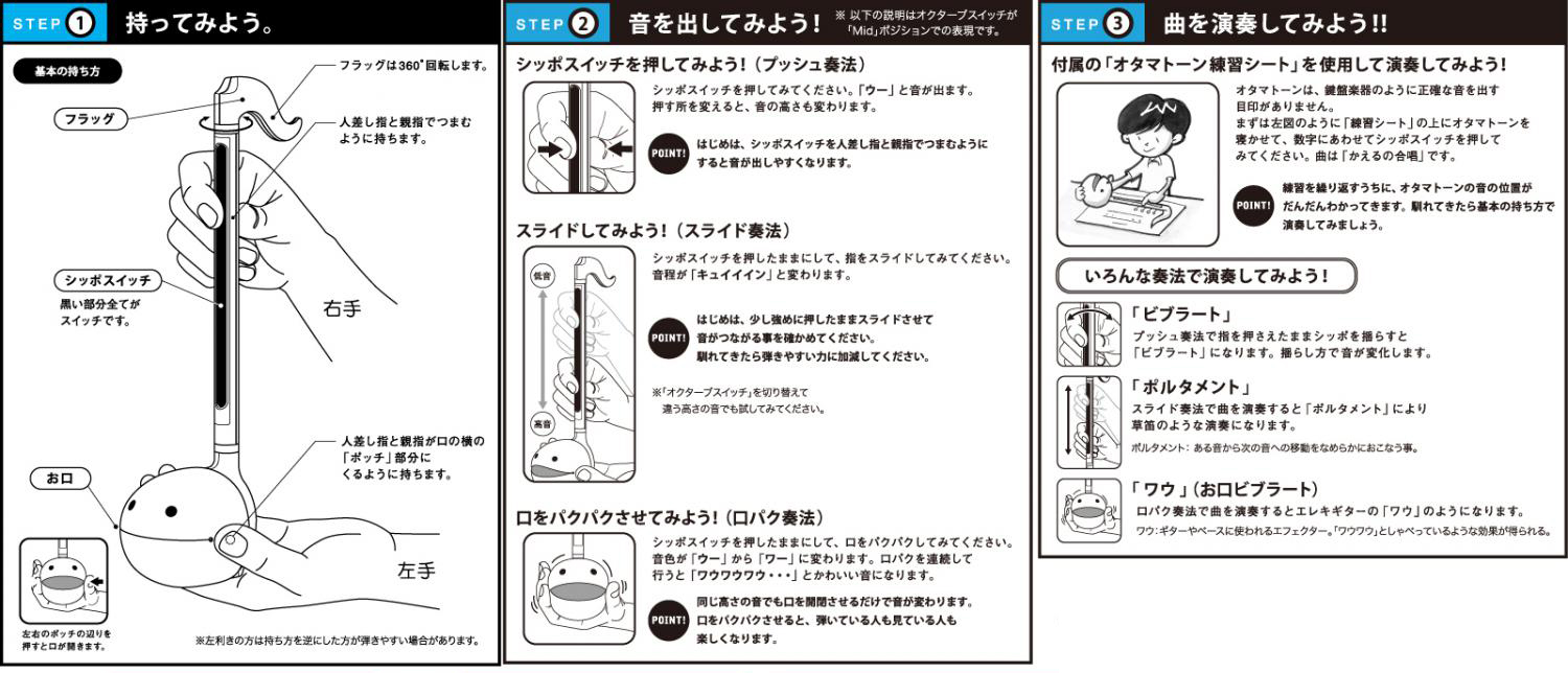 ギターのエフェクターで「ワウ」というものがあるのですが、その名の通り「ワウワウワウ...」ときこえます。オタマトーンの口を開けたり閉めたりする口パク奏法でその効果が得られます。