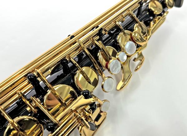 ヤマハのラインナップにはクリアラッカー仕上げはありませんがサックスや金管楽器の仕上げではよく使用されます。YAS-82ZBは管体がブラックラッカー仕上げ、キイはゴールドラッカー仕上げ。