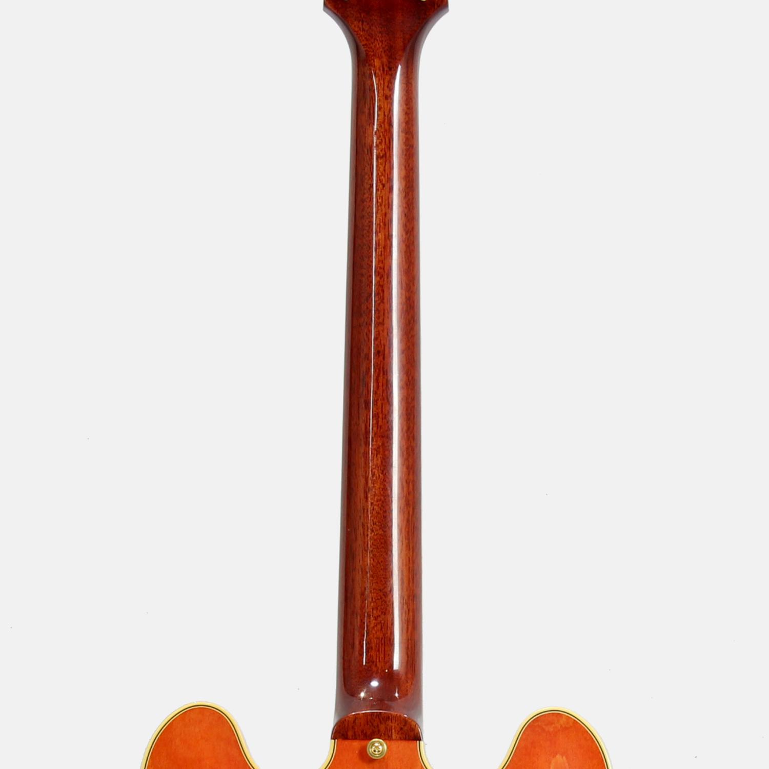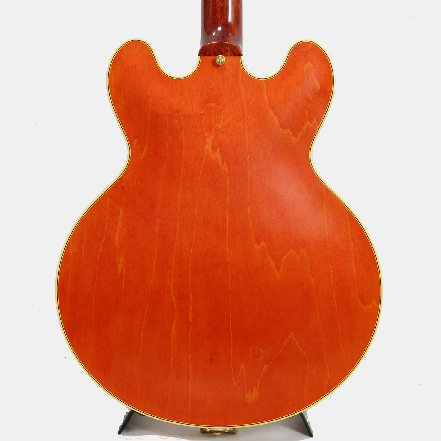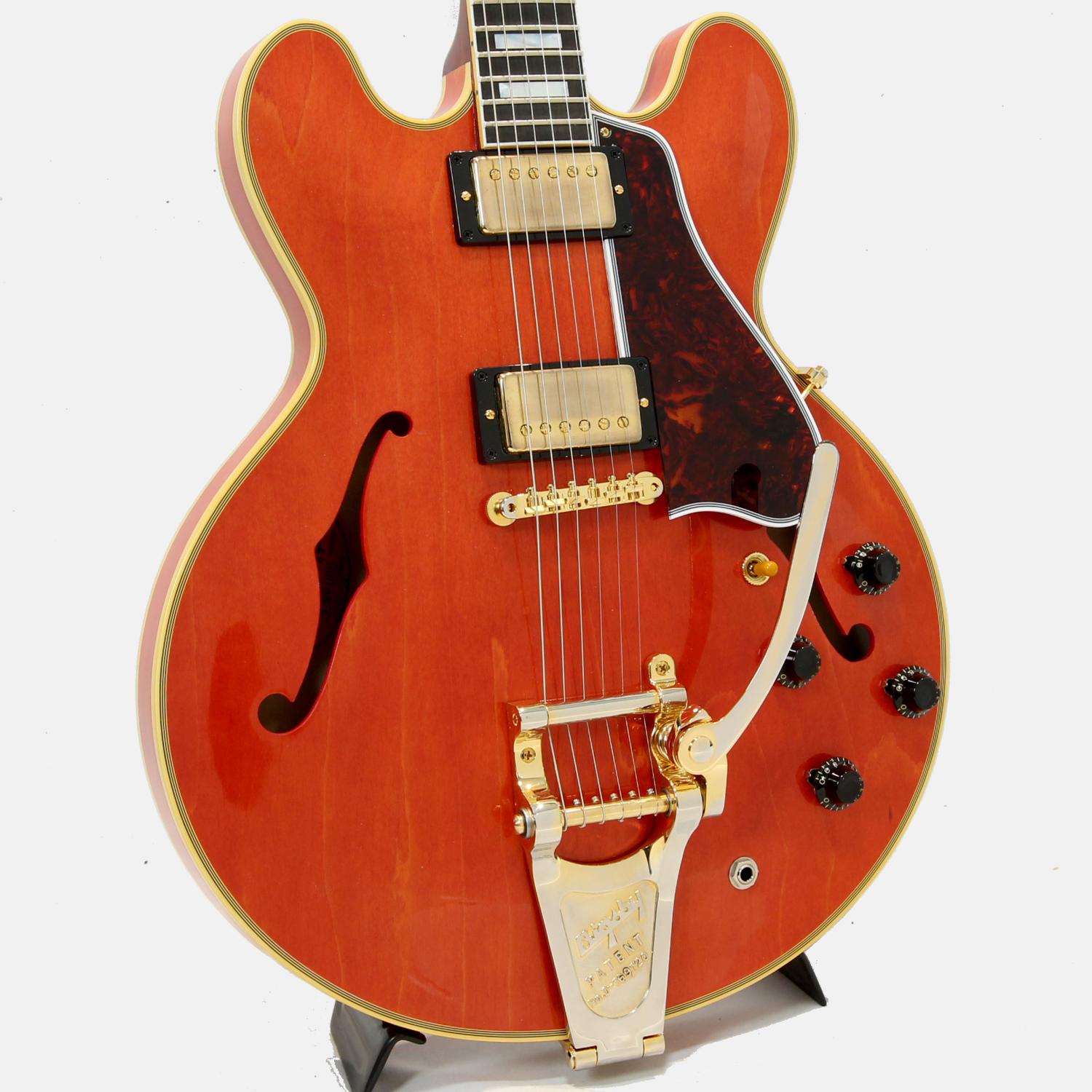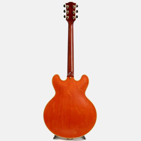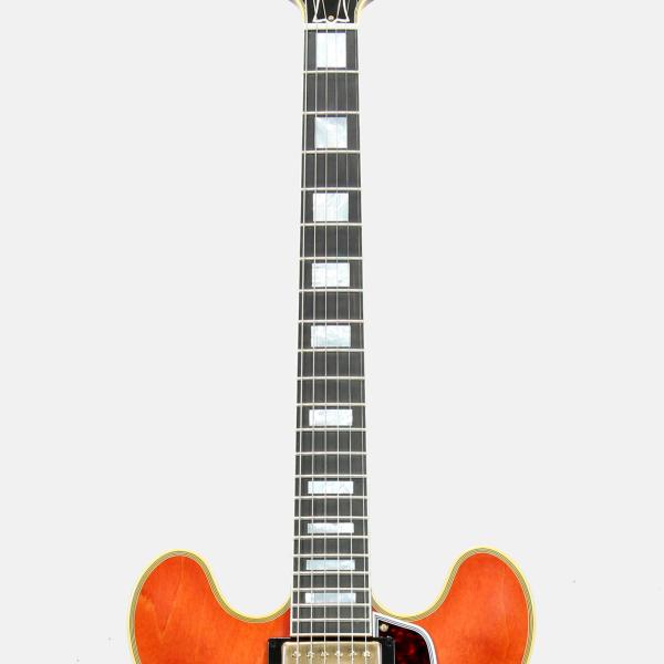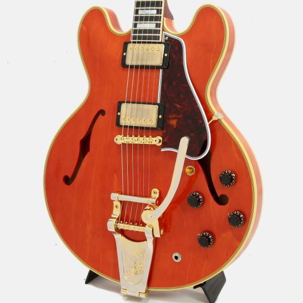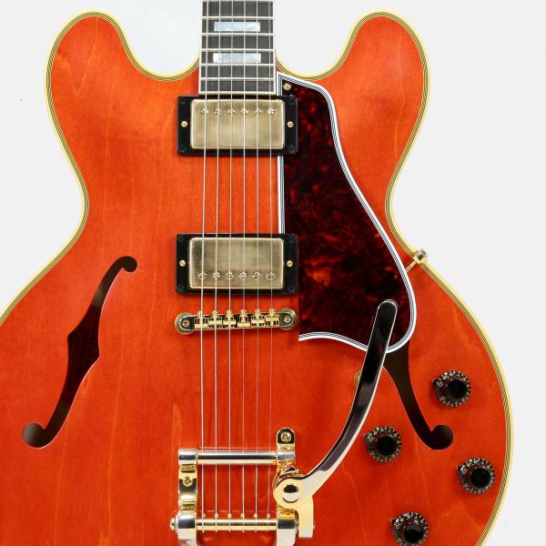 通称ミッキーマウス・イヤーと言われる丸みを帯びたカッタウェイシェイプ。スプリットダイヤモンドのヘッドストックインレイ、ブロックポジション、マルチプライ・バインディング、ゴールドのハードウェアとESシリーズ最上位モデルたらしめるES-355。ヴィンテージオリジナルパーツの調査から復刻されたレプリカパーツによりリアルな風格を持つ本機。当時少量ながら製作された淡いチェリーカラー"ウォーターメロンレッド"もセミアコファン大感激の仕上がりです。