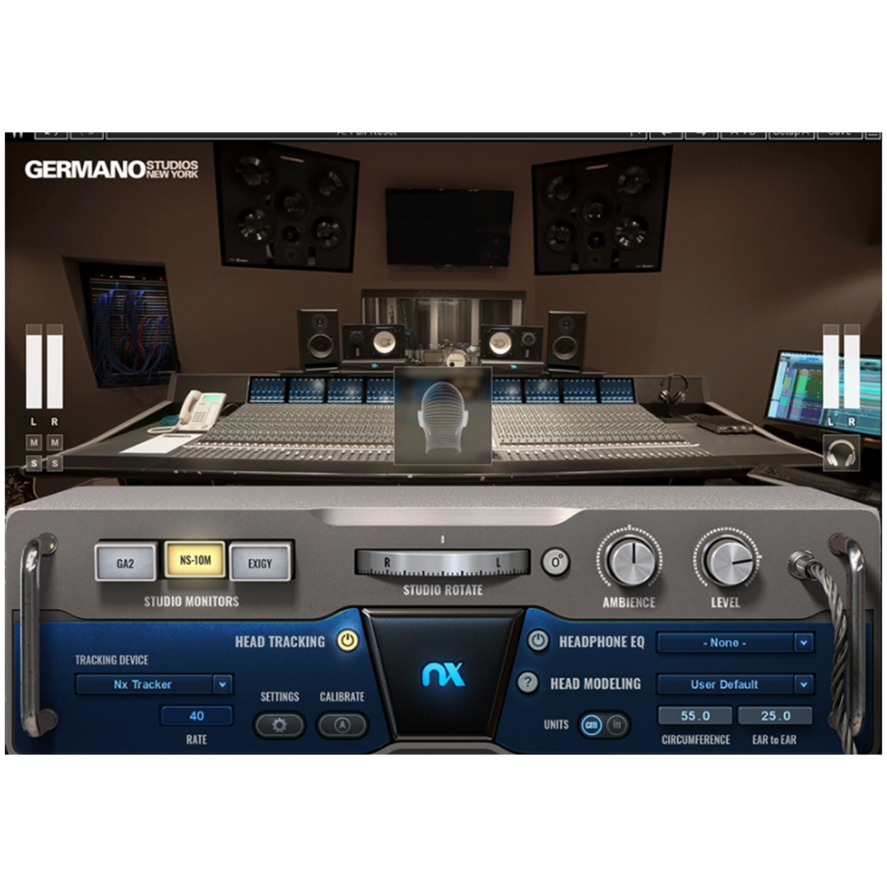 Nx Germano Studiosプラグインは精密な音響測定とチャンネルクロストーク、聴覚間遅延(ITD)、フィルター(ILD)、ルームリフレクション、ヘッドモーショントラッキングからなるWaves Nx 空間テクノロジーに基づき、Germanoの「スタジオ1コントロールルーム」の音響特性を正確に再現しています。