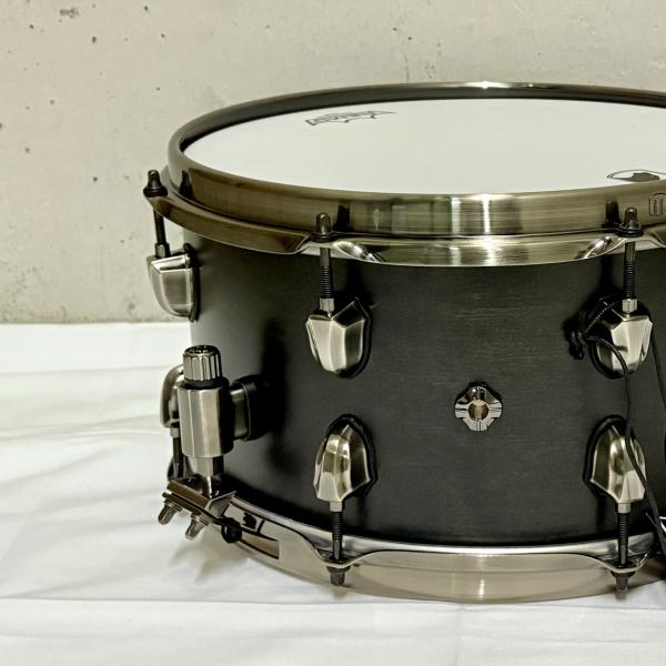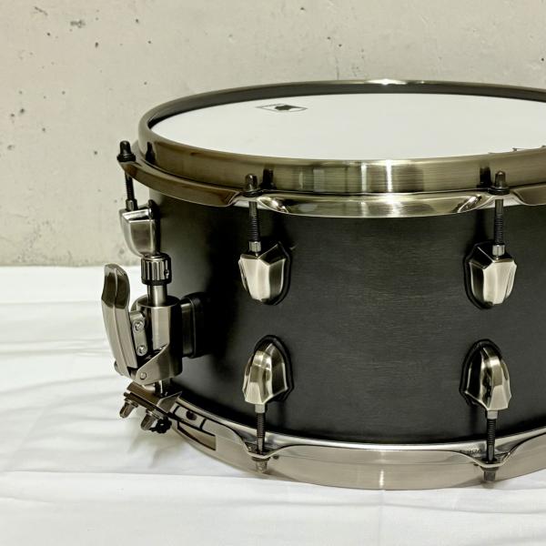 Black Pantherスネアとはそれぞれのモデルに名前を名づけ、その名前にふさわしいデザインと個性的なサウンドを持つスネアシリーズです。スペック詳細もウッドスネアはシェルによって構造と厚みを細かく設定、メタルスネアも材質と厚みのバランスをうまく整えて設計、ラグの形状や位置にもこだわりを持つ特徴的なシリーズです。