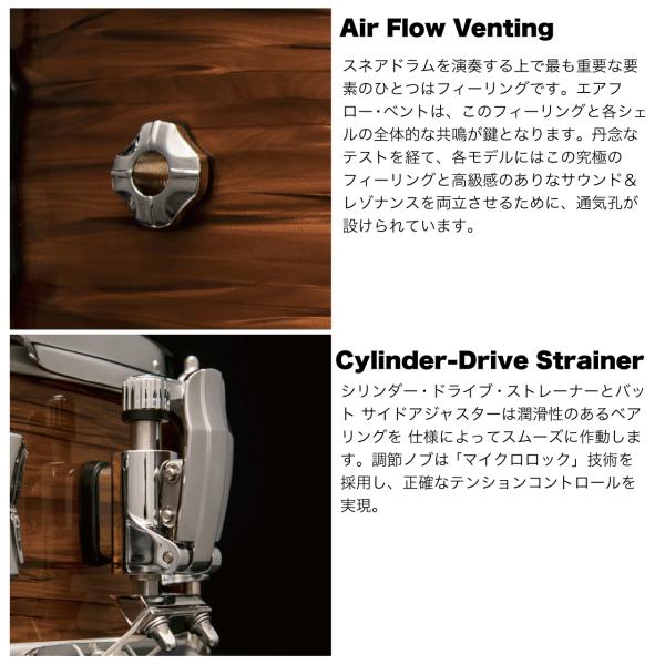 スネアドラムを演奏する上で最も重要な要素のひとつはフィーリングです。エアフロー・ベントは、このフィーリングと各シェルの全体的な共鳴が鍵となります。丹念なテストを経て、各モデルにはこの究極のフィーリングと高級感のありなサウンド&レゾナンスを両立させるために、通気孔が設けられています。