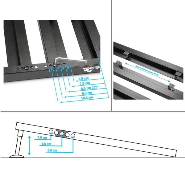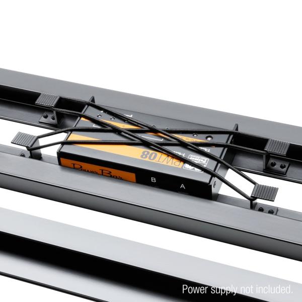 使用するペダルのサイズに合わせ、六角レンチでレールの間隔を変更することができます。 並びに奥側のゴム足でペダルボードの高さ、傾斜角度が個別に調節できます。 ボードの表面にマジック・テープが張られており、ご購入後すぐアレンジしていただけます。 セットにゴムバンドが付属されており、フックで電源や周辺機器をボードの下に固定することができます。 電源とPEDALBAYを別々に運搬する必要もなく、楽々と移動できます。外ポケット付き撥水性のある ソフトケースと持ち運び用のショルダーストラップが付属します。