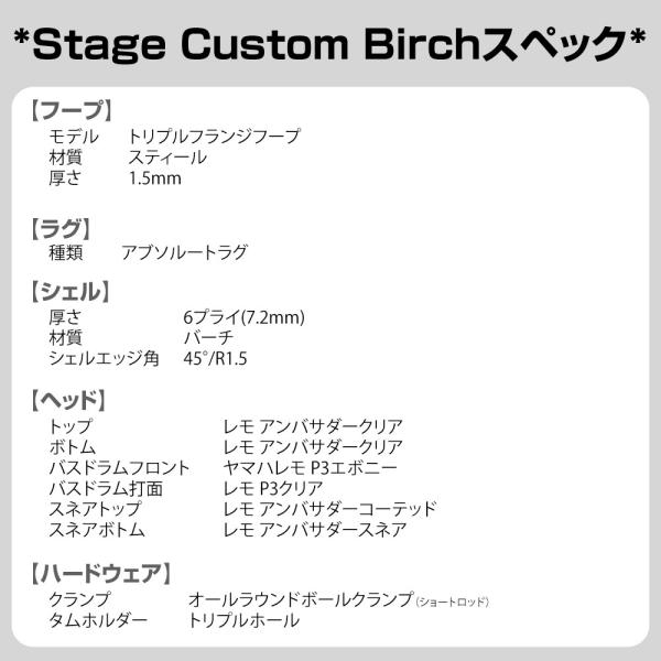 ヤマハドラムの代名詞とも言えるバーチ材100%を使用し、上位機種譲りの機構を施しワンランク上のセットドラムとして生まれ変わったステージカスタムバーチ。バーチ材特有の中音域の豊かな響きを実現。ヤマハドラムの代名詞とも言えるバーチ材100%を使用。上位機種譲りのタムマウント、メタルパーツを採用し、進化を遂げた新生ステージカスタムバーチ。バーチ材特有の中音域の豊かな鳴りとセンシティビティを具現化したワンランク上のセットドラム。