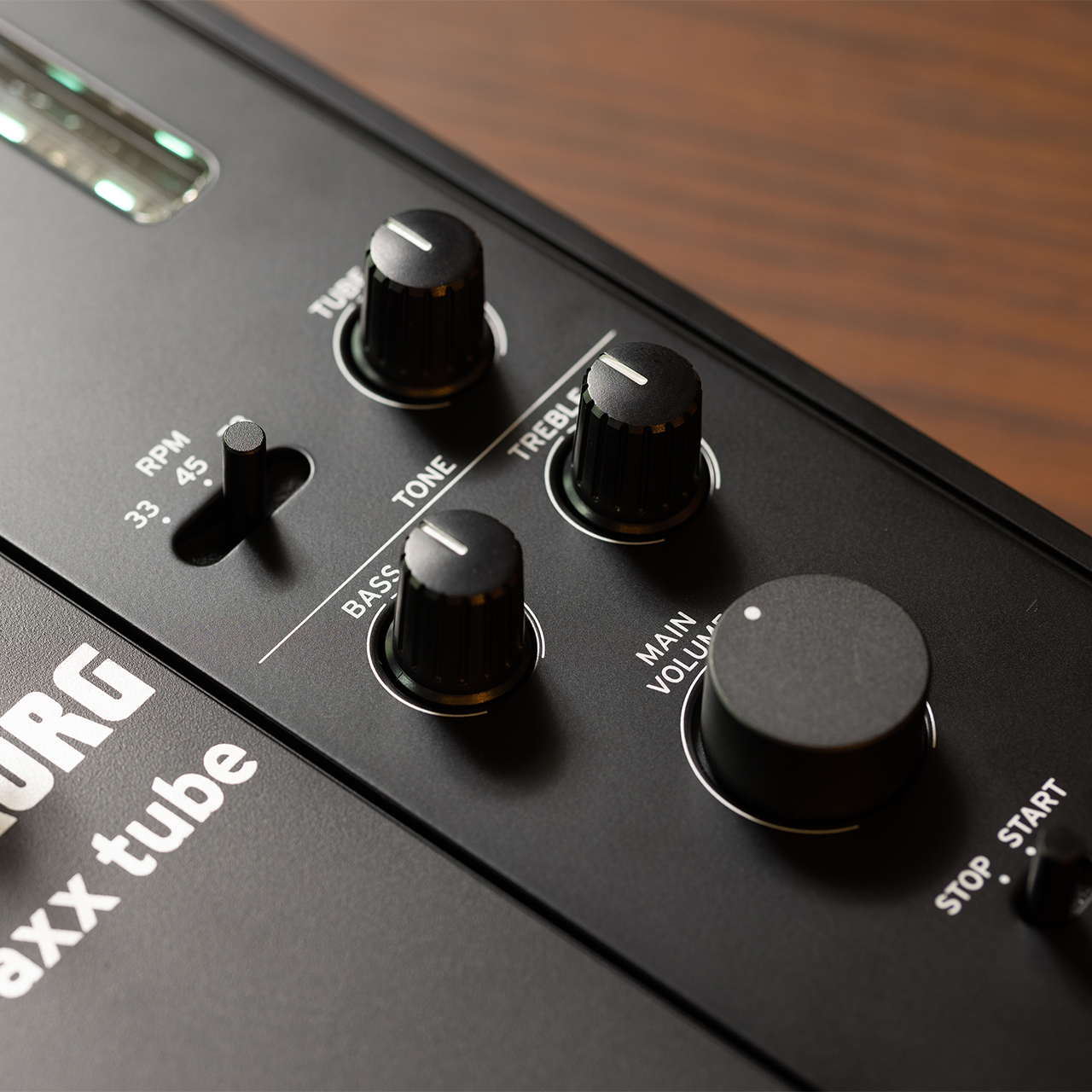 各パーツは音質を最優先に作り上げられており、精密で安定した回転を実現するアルミ・ダイキャスト製のプラッター*、MMカートリッジを搭載したバランス調整付きトーン・アーム、そしてコルグの革新的な次世代真空管Nutubeによって駆動されるフォノ・アンプがそこに含まれています。