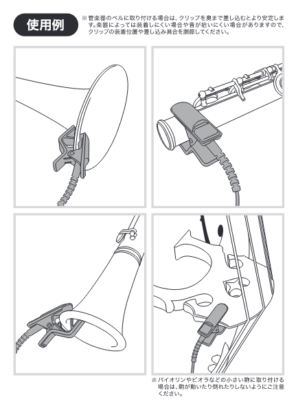 楽器にマイク部を装着させることにより振動を直接チューナーに送る脱着容易なクリップタイプのマイクです。ミニジャックです。