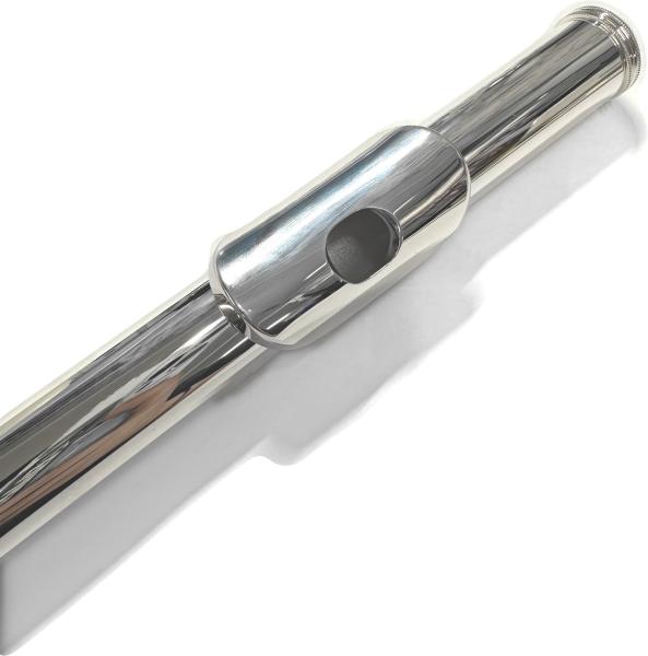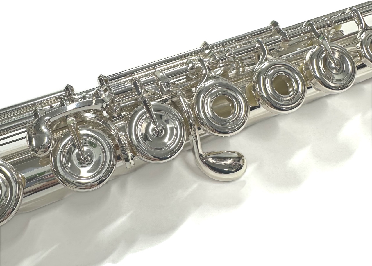 安いフルートは主に洋白(白銅)を素材としており、上位モデルにいくほど銀を使用している部分が多くなります。シリーズのラインナップによって使われる銀の部分が多くなるのがお分かりいただけるかと思います。素材、メッキは音を出す上で大きな影響があるもので、さらに口元に近い部分はよりその影響が強いとされています。ですので、銀、金が使われるのはリップ/ライザーからはじまり徐々に広がってきます。この素材の違いが響きや音質に関わる重要な部分ですが、銀や金を使用することで同時に抵抗感を感じられることになります。