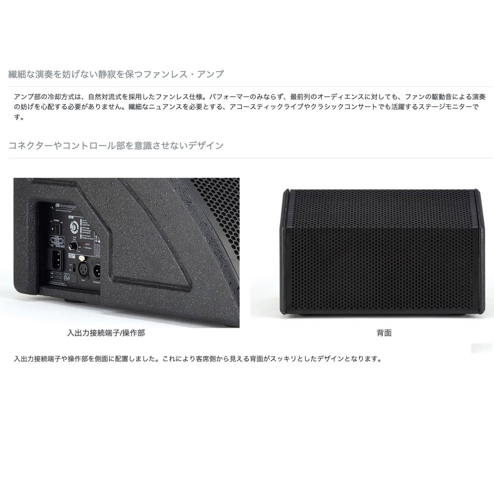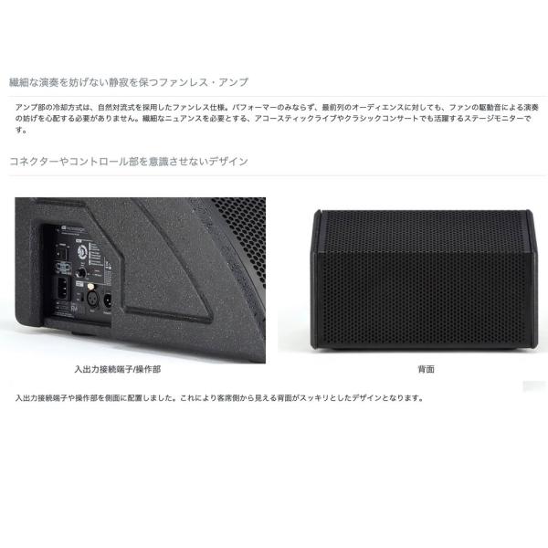 繊細な演奏を妨げない静寂を保つファンレス・アンプ アンプ部の冷却方式は、自然対流式を採用したファンレス仕様。 パフォーマーのみならず、最前列のオーディエンスに対しても、ファンの駆動音による演奏の妨げを心配する必要がありません。 繊細なニュアンスを必要とする、アコースティックライブやクラシックコンサートでも活躍するステージモニターです。
