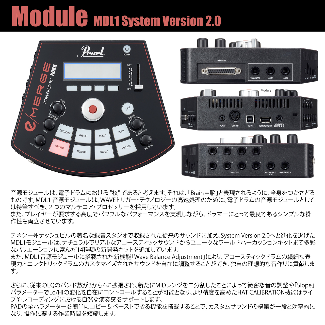音源モジュールは従来のトップパネルを踏襲し、ドラマーの操作性を考慮したシンプルなデザインとPearlの厳選されたアコースティックドラム音色はそのままに、アーティストとのコラボレーションによって制作された多彩な14種の新開発キットや、EQバンドの拡張や「Slope」パラメーターによるLo/Hiの変化コントロール、HAT CALIBRATION機能でのハイハットの表現力向上により、プレイヤーの可能性をさらに広げます。また、PADのコピー&ペースト機能や全体のサウンドを確認しながら特定のPAD編集が可能なアップデートにより作業効率も向上。さらに、EM-MDL1モジュールに新機能「Wave Balance Adjustment」を搭載し、アコースティックドラムの豊かなダイナミクスとエレクトリックドラムのサンプル重視のサウンドを自由に調整できます。これにより、自分だけの理想的な音を創り上げ、全く新しいドラミング体験を提供します。