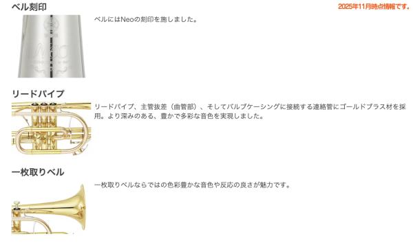 Neoシリーズの全ラインアップにおいて世界トップクラスのブラスバンド奏者を開発協力者に迎え、今まで常識とされてきたパーツや構造を再検証し、演奏家の要望に高い次元で応える新たなデザインは、これからのブラスバンドをリードする「現代のかたち」となるでしょう。