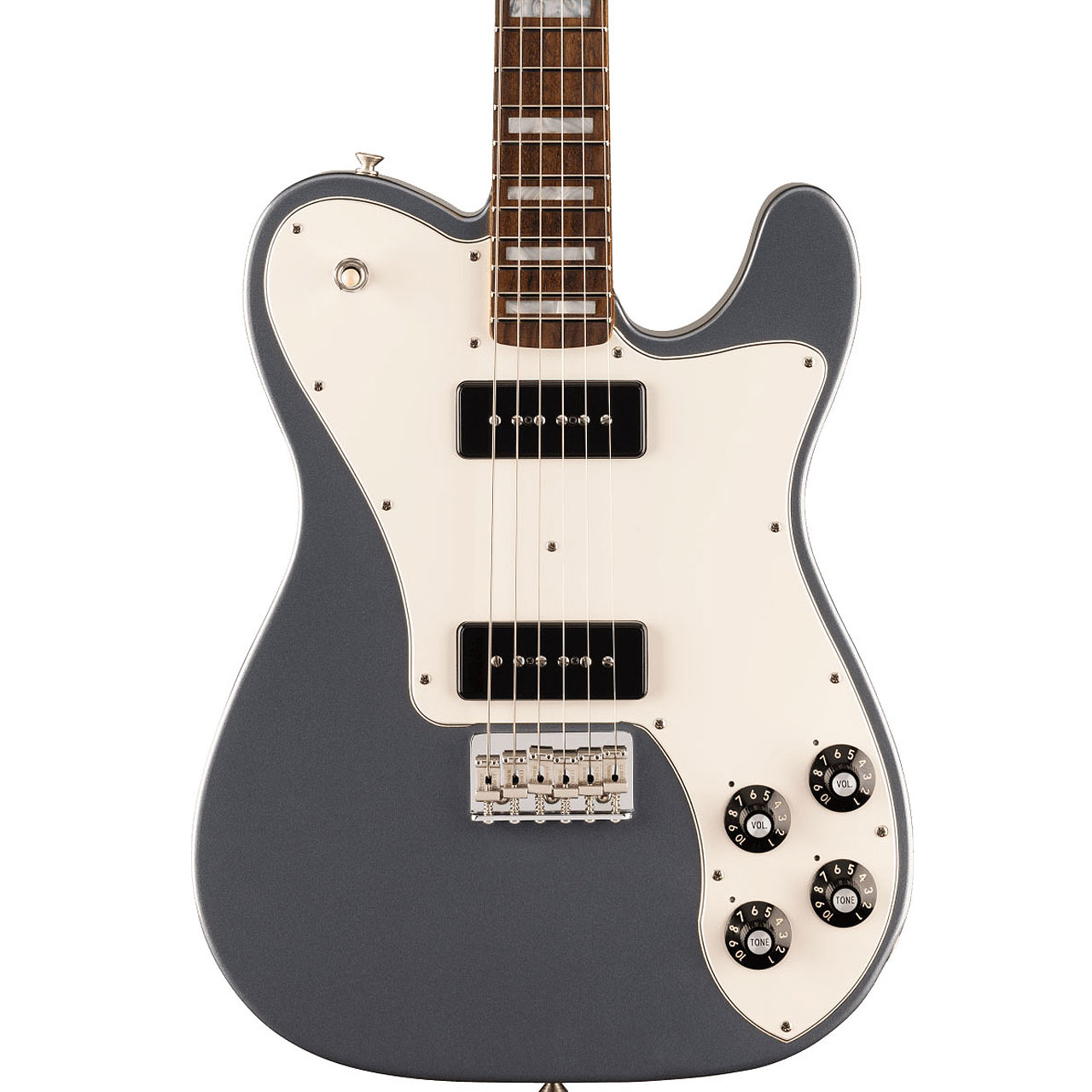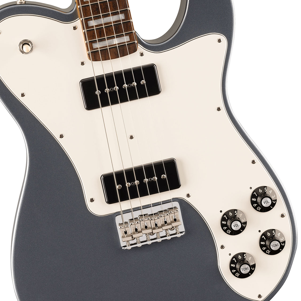 ニトロセルロースラッカーフィニッシュのアルダーボディバックには、長時間の演奏でも快適な「ベリーカット」コンター加工を施しています。25.5インチスケールのメイプルネックには、21本のミディアムジャンボフレットを配した12インチラジアスローズウッド指板を採用。パーロイドブロックインレイが、このギターにクラシカルな気品を添えます。2基のCustom Chris Shiflett "Cleaver" Noiseless CS-90ピックアップは、パワフルな出力とヴィンテージシングルコイルのようなコシのあるミッドレンジのパワー感と甘美で音楽的なハイエンドトーンをノイズレスに提供します。Fスタイルのチューニングマシン、ボーンナット、ナイロンスペーサー付きウイングストリングツリーは、長時間のステージセットでも正確なチューニングを維持し、ストリングスルーボディ式のハードテイルブリッジは、レゾナンスとサスティンを向上させます。
