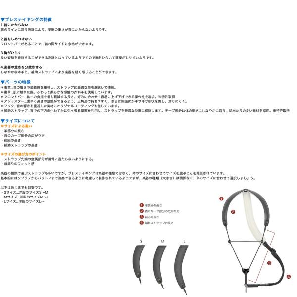楽器の種類で選ぶストラップも多いですが、ブレステイキングは楽器の種類ではなく、体のサイズに合わせてサイズを選ぶことを推奨されています。