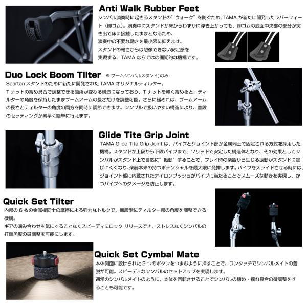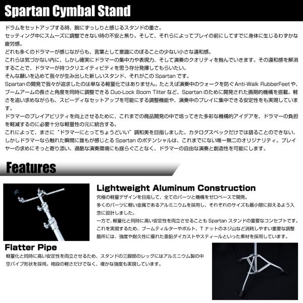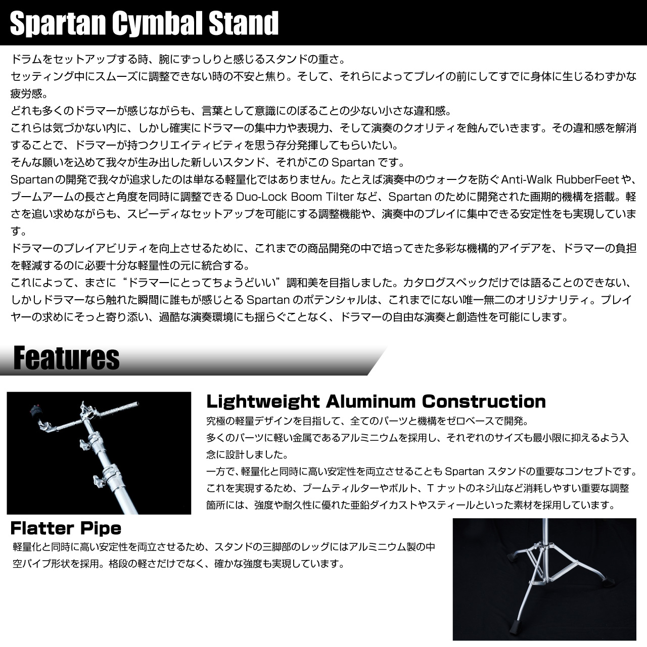 セッティング中にスムーズに調整できない時の不安と焦り。 そして、それらによってプレイの前にしてすでに身体に生じるわずかな疲労感。 どれも多くのドラマーが感じながらも、言葉として意識にのぼることの少ない小さな違和感。 これらは気づかない内に、しかし確実にドラマーの集中力や表現力、そして演奏のクオリティを蝕んでいきます。 その違和感を解消することで、ドラマーが持つクリエイティビティを思う存分発揮してもらいたい。 そんな願いを込めて我々が生み出した新しいスタンド、それがこのSpartanです。 Spartanの開発で我々が追求したのは単なる軽量化ではありません。 たとえば演奏中のウォークを防ぐAnti-Walk Rubber Feetや、ブームアームの長さと角度を同時に調整できるDuo-Lock Boom Tilterなど、Spartanのために開発された画期的機構を搭載。 軽さを追い求めながらも、スピーディなセットアップを可能にする調整機能や、演奏中のプレイに集中できる安定性をも実現しています。 ドラマーのプレイアビリティを向上させるために、これまでの商品開発の中で培ってきた多彩な機構的アイデアを、ドラマーの負担を軽減するのに必要十分な軽量性の元に統合する。 これによって、まさに“ドラマーにとってちょうどいい”調和美を目指しました。 カタログスペックだけでは語ることのできない、しかしドラマーなら触れた瞬間に誰もが感じとるSpartanのポテンシャルは、これまでにない唯一無二のオリジナリティ。 プレイヤーの求めにそっと寄り添い、過酷な演奏環境にも揺らぐことなく、ドラマーの自由な演奏と創造性を可能にします。 スペック