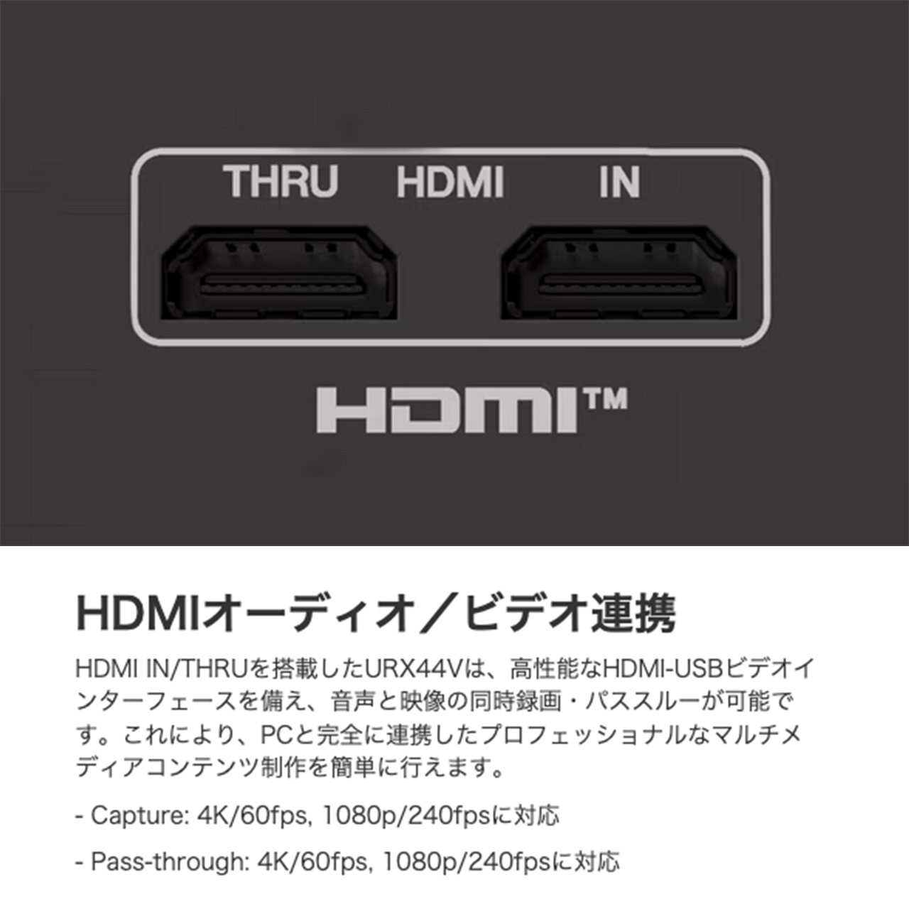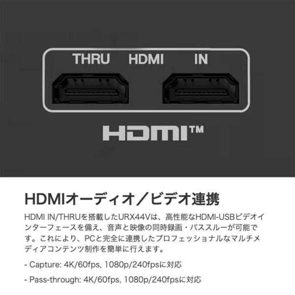 HDMI IN/THRUを搭載したURX44Vは、高性能なHDMI-USBビデオインターフェースを備え、音声と映像の同時録画・パススルーが可能です。