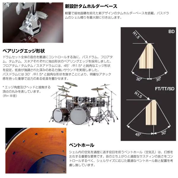 ドラムセット全体の音色を最適にコントロールする為に、バスドラム、フロアタム、タムタム、スネアそれぞれに独自形状のベアリングエッジを採用しました。