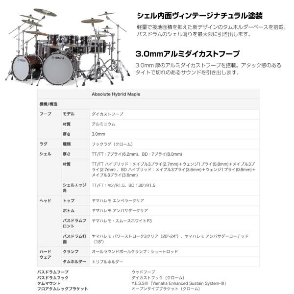 シェルの中心部に強度の高いウェンジ材を採用し、その両側をメイプル材で挟み込んだハイブリッド構造。~プレイヤーが求めているサウンドを最大限に実現する~それを叶えるのがアブソルートハイブリッドメイプルです。