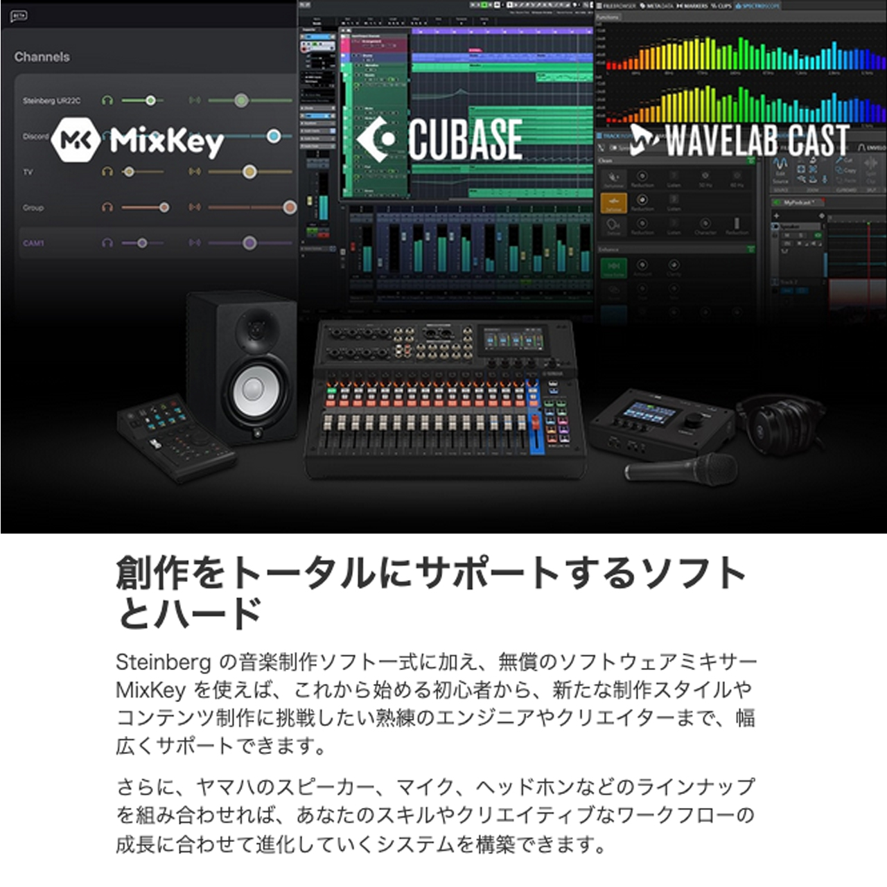 Steinberg の音楽制作ソフト一式に加え、無償のソフトウェアミキサー MixKey を使えば、これから始める初心者から、新たな制作スタイルやコンテンツ制作に挑戦したい熟練のエンジニアやクリエイターまで、幅広くサポートできます。 あなたに寄り添うスムーズなコントローラー連携