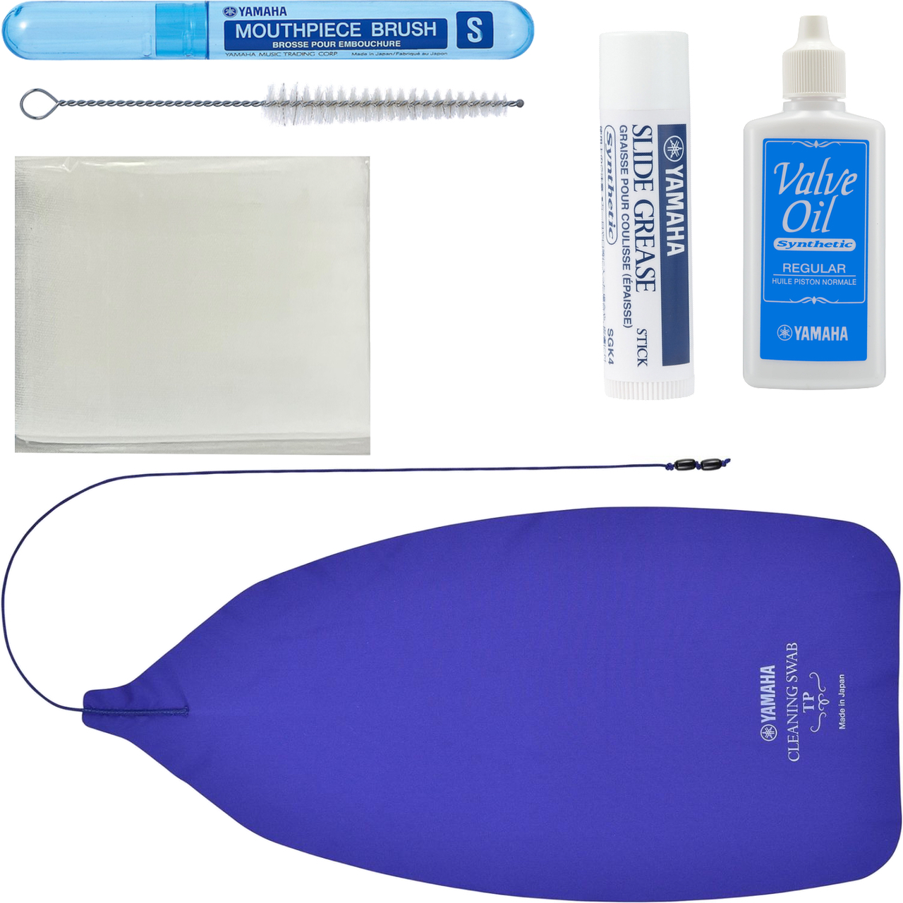 YAMAHA winds accessories care Alto horn ヤマハ お手入れ用品 楽器 メンテナンス お掃除セット内容 ■バルブオイル レギュラー ヤマハ VOR3 60ml ピストン、バルブケーシング用の100%化学合成オイル。吹奏楽で一般的なヤマハのスチューデントモデル(スタンダードモデル)に付属しているオイルがこのバルブオイル「レギュラー」です。ピストンの可動には必須。 ■スライドグリススティック ヤマハ SGK4 容量 5g 100%化学合成のグリス成分により、常に塗りやすく滑らかな抜差動作が得られます。抜差管表面に、安定したグリス皮膜を形成します。また、防錆剤の添加により抜差管を錆から守ります。これがないと管は摩擦で動きません。 ■ガーゼ バラ1枚 60cm×32cm ※ヤマハではありません。 ■クリーニングスワブ ヤマハ CLSTP3 テグス付き マイクロファイバー 吸水性抜群で、とてもしなやかです。演奏後に抜差管管内に通して水分を取ります。テグスの長さは約61cm(スワブ生地に縫い付けてある箇所も含みます) ☆トランペット、コルネットのマウスパイプ、主管・第1・第2・第3抜差管、フリューゲルホルンのマウスパイプ、第1・第2・第3抜差管、アルトホルン、ロータリートランペットの主管・第1・第2・第3抜差管に使用できます。※メーカーやモデルによっては使用できないものもあります。 ■マウスピースブラシS ヤマハ MPBS2 マウスピースのサイズにあったものを基本的に使用します。日々、水でブラッシングし綺麗に水分を取れば良い状態をキープできることでしょう。
