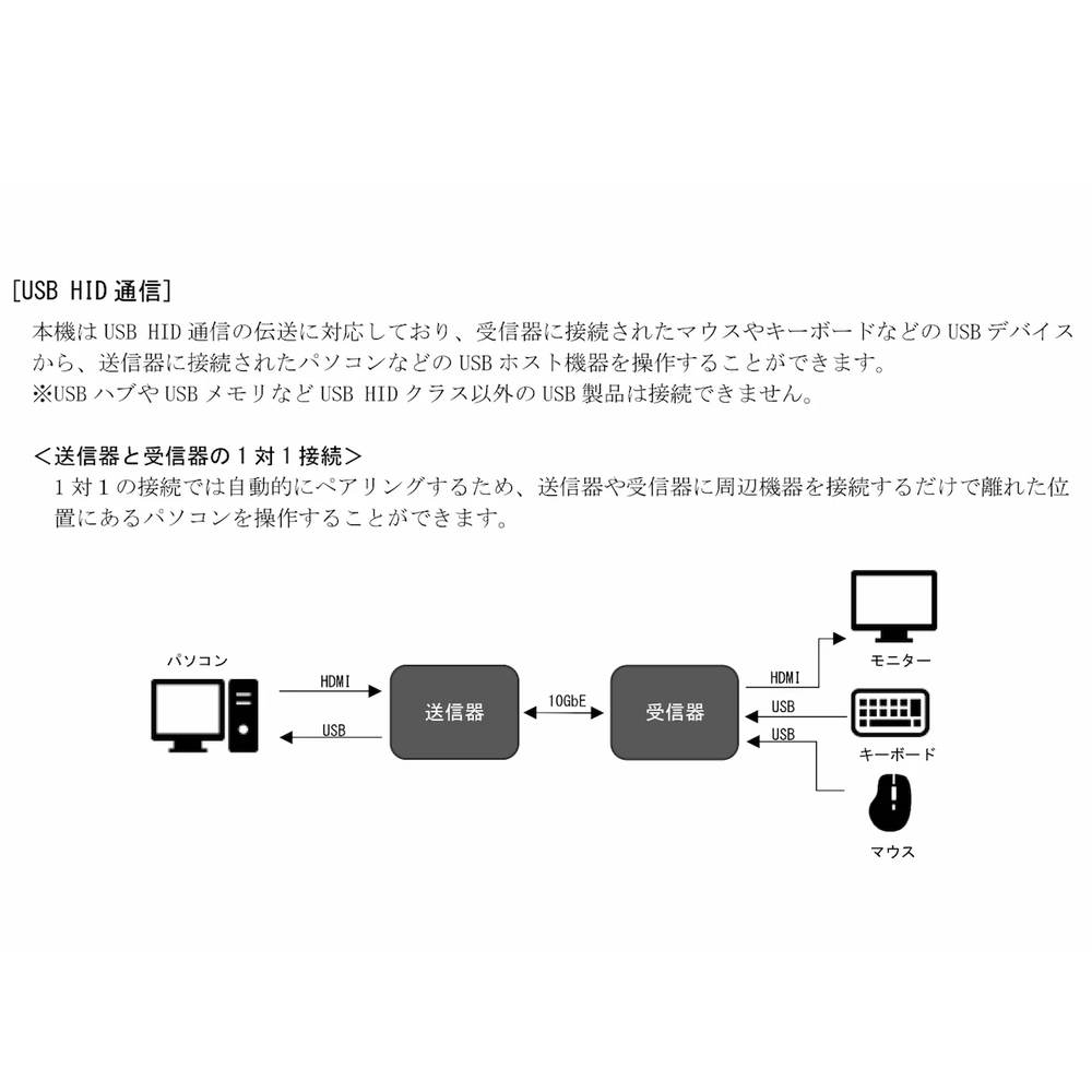 ・USBのHID クラス相当 Type-A 2 系統 を延長・切替可能。