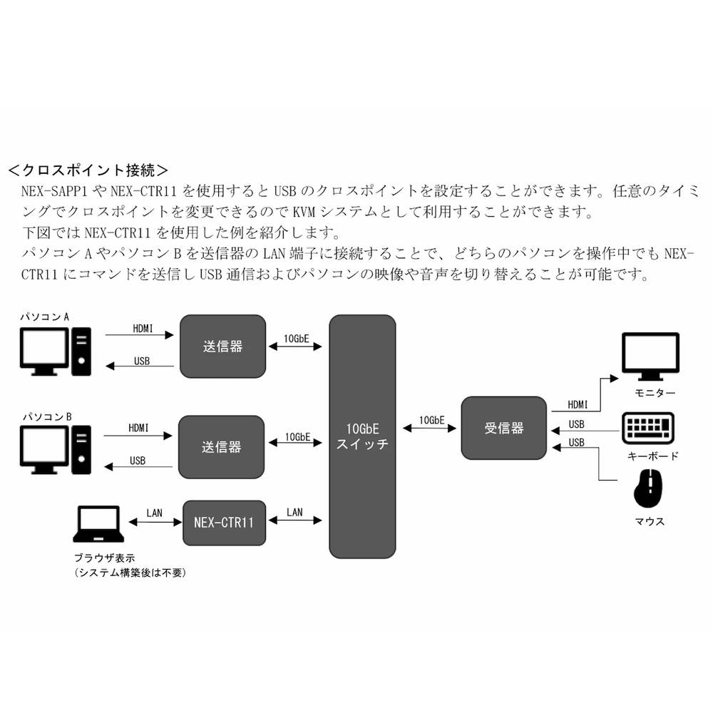 映像信号や音声信号の他に、USBと1000BASE-T までのLAN を伝送できるほか、NEX-SMART 用のコントローラーやアプリケーションおよび