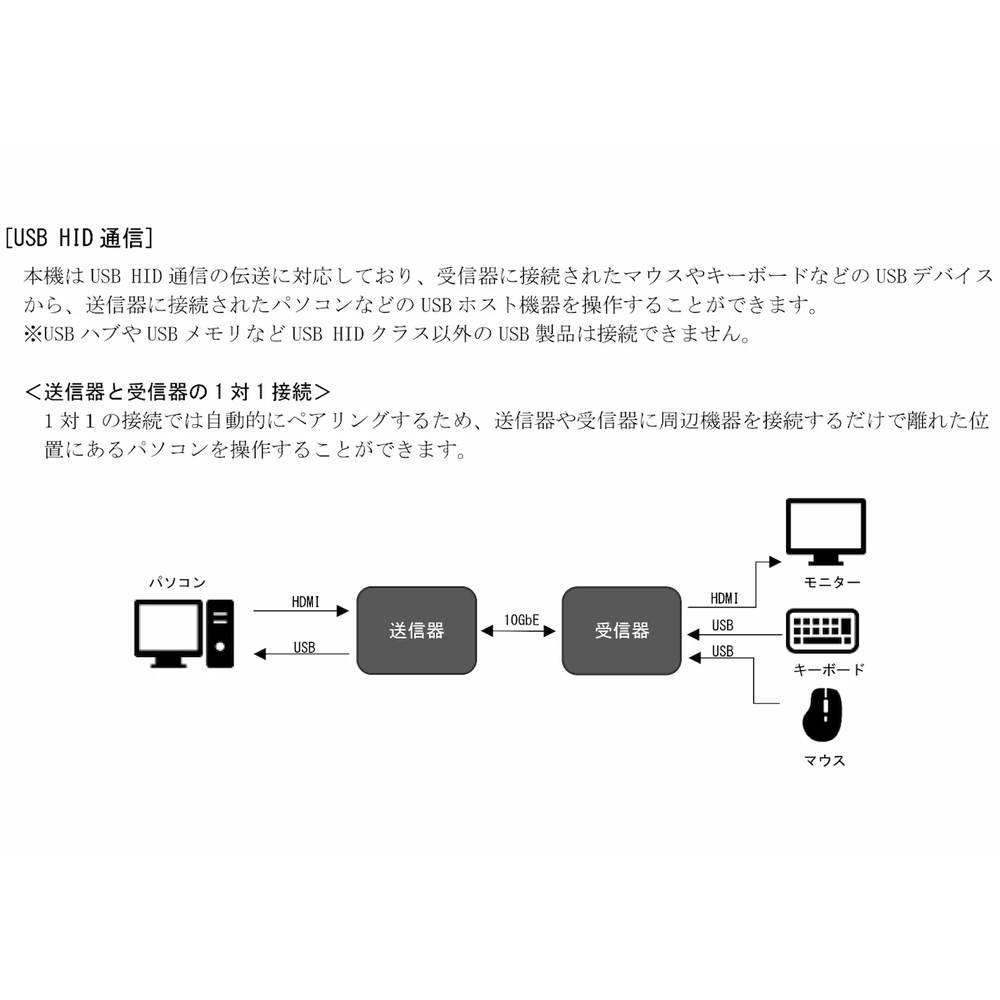 ・USBのHID クラス相当 Type-A 2 系統 を延長・切替可能。