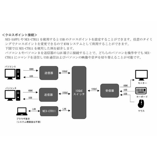 映像信号や音声信号の他に、USBと1000BASE-T までのLAN を伝送できるほか、NEX-SMART 用のコントローラーやアプリケーションおよび