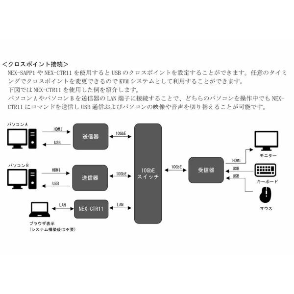 映像信号や音声信号の他に、USBと1000BASE-T までのLAN を伝送できるほか、NEX-SMART 用のコントローラーやアプリケーションおよび