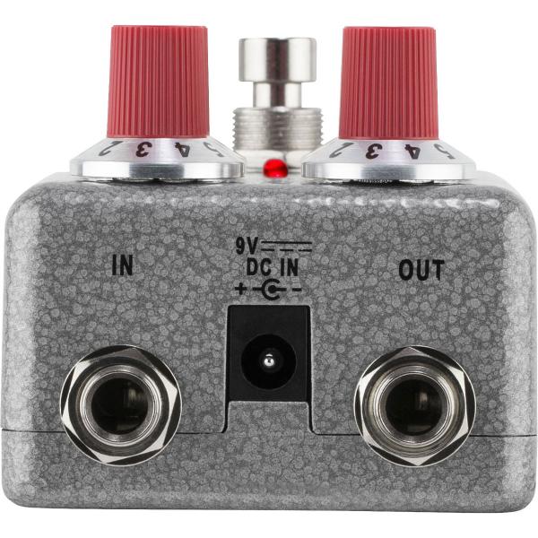 堅牢度の高いシルバーの 4.375” x 2.375” x 1.25”サイズの筐体にはペダルボード上での使用を想定し、インプット/アウトプットのジャックを上部にまとめるという工夫が成されています。