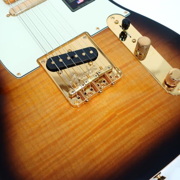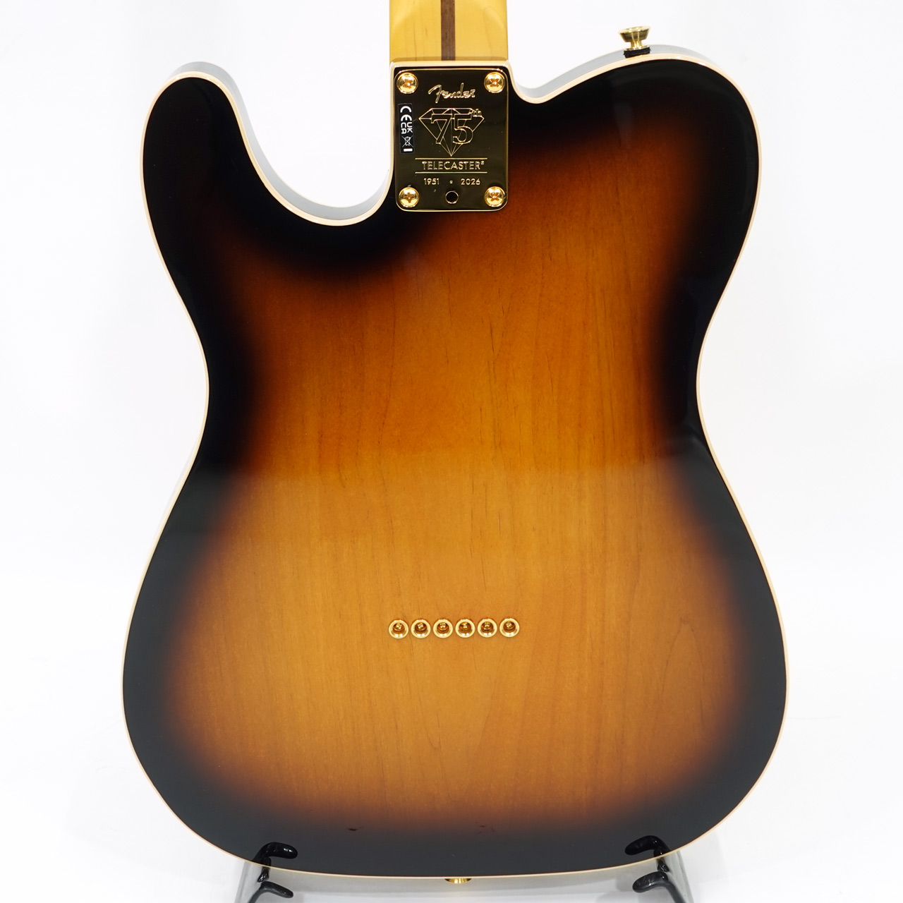 75th Anniversary American Professional II Telecasterは、レゾナンス豊かなアルダーボディに美しいフレイムメイプルトップを組み合わせ、クラシックな2トーンサンバーストで仕上げています。優雅なダブルバインディングのボディは洗練された気品を放ちます。