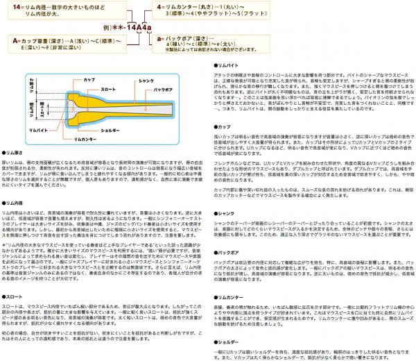*“リム内径の大きなマウスピースを使っている奏者ほど上手なプレイヤーである”といった誤った認識が少なからずあるようです。確かに大きいサイズのマウスピースを利用するには、“強い”唇が必要ですが、音楽ジャンルによって求められる良い音は変化し、プレイヤーはその理想の音を出すためにマウスピースや楽器を必死になって選ぶのです。一般にジャズプレイヤーに好まれる小さいマウスピースとシンフォニーオーケストラのプレイヤーに好まれる大きなマウスピースとを比較するのは無意味です。さらに言えば、リム内径の基準は音楽ジャンルのみにあるのではなく、奏者自身のなかにこそ存在するのであり、各個人が自分の求める音のイメージを持つことが大切です。