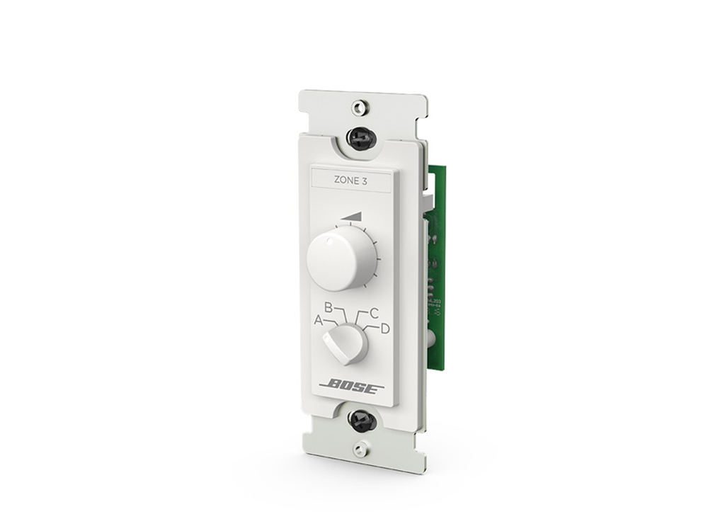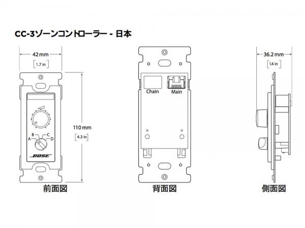 ControlCenter CC-3 zone controllerは、ControlSpace製品用に音量調節と4系統のソース切り替え機能を提供します。日本の電工ボックス (1個用)に対応したモデルとなります。カラーはブラックとホワイトです。RJ-45コネクターを搭載しており、配線はCAT 5ケーブルで行います。