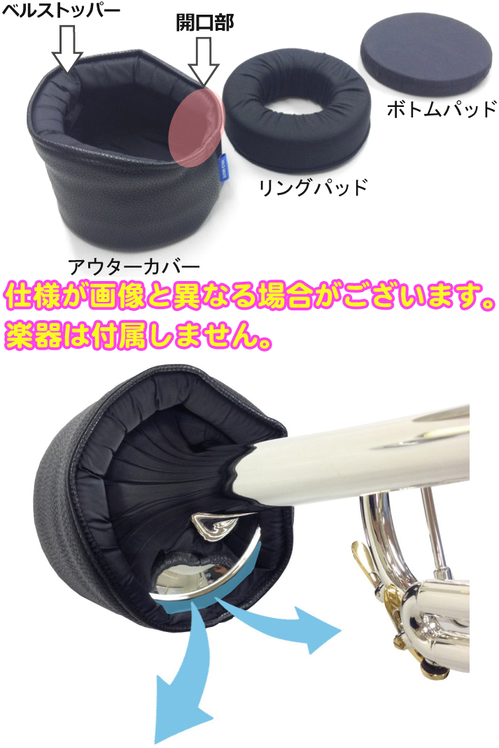 例えばピッコロトランペットはベルサイズが小さいですので、ベルストッパーにクロスなどをかぶせてベル固定箇所を小さくするなどすればご使用いただけます。入れる物や量によって抵抗感と弱音効果が変化しますので、工夫次第で多用に使用いただけおすすめです。これまでのミュートとは別物となりますので、1つは持っておきたいものですね。