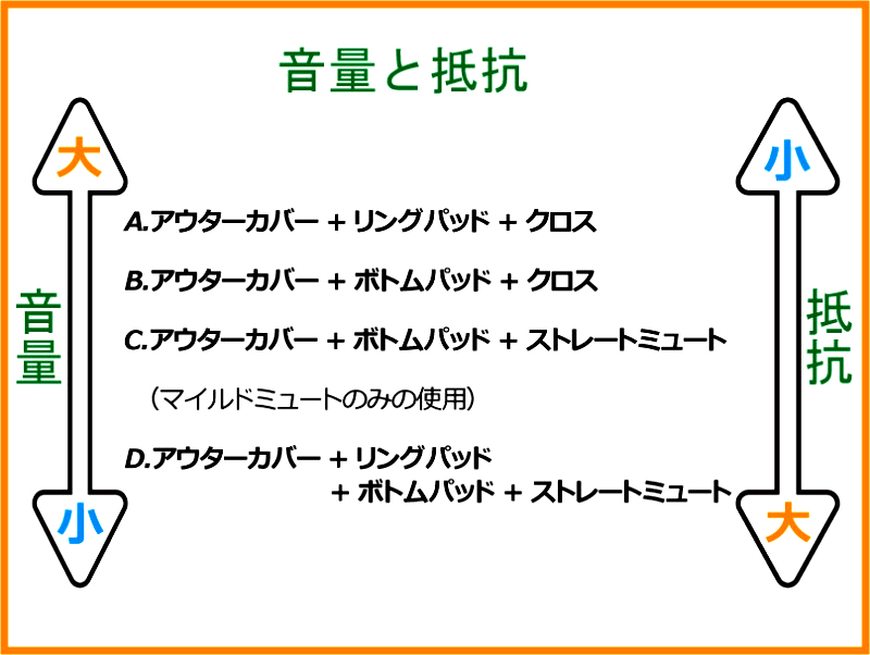 抵抗感があるというのはそれだけ消音できているという証拠でもありますので、市場に出回るそれなりの価格のサイレンサーの方が、残念ながら消音効果としては優れてはいるのですが、「練習用ミュート」としては実際の吹奏感なしには練習にならないのが実際のところだと思います。