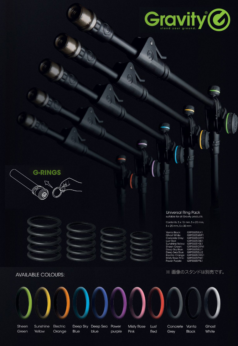 Gravityスタンド用のG-RING Universal Ring Packです。 GravityのG-RING対応スタンドのリングを交換することにより視覚的効果を演出。 ステージ上の位置やパフォーマー別の色分けなど用途は色々です。 貴方好みのカラーに演出してみてください。