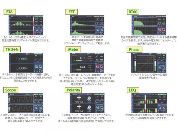PAA6はリアルタイムスペクロタム(RTA)、RT60、トーンジェネレーター、LEQ、EQ設定、フェイズチェック等の基本機能の他、SLM、FFT、THD+N、スコープ機能を有し、正確な測定が出来る2本のマイクを内蔵しています。